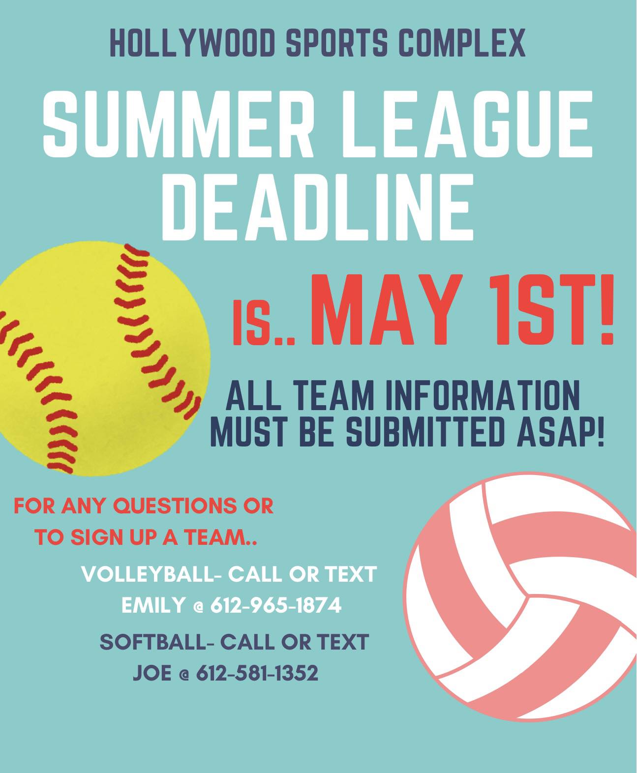 SUMMER LEAGUE DEADLINE IS MAY 1ST! If you are still thinking about signing up a volleyball or softball team- PLEASE contact us ASAP!We can’t wait for a fun season!!