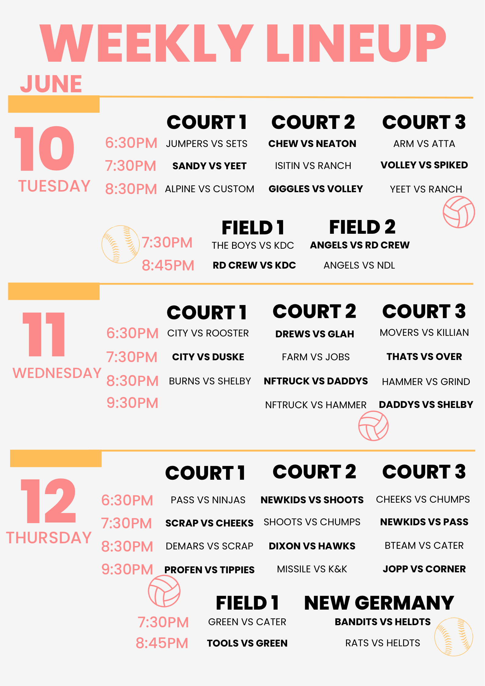Volleyball & softball line up for June 10th – 12th!